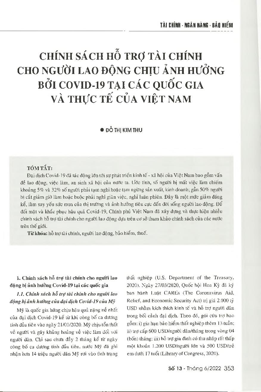 Chính sách hỗ trợ tài chính cho người lao động chịu ảnh hưởng bởi Covid-19 tại các quốc gia và thực tế của Việt Nam = Financial support policies for workers affected by the COVID-19 pandemic of countries in the world and the current situation in Vietnam