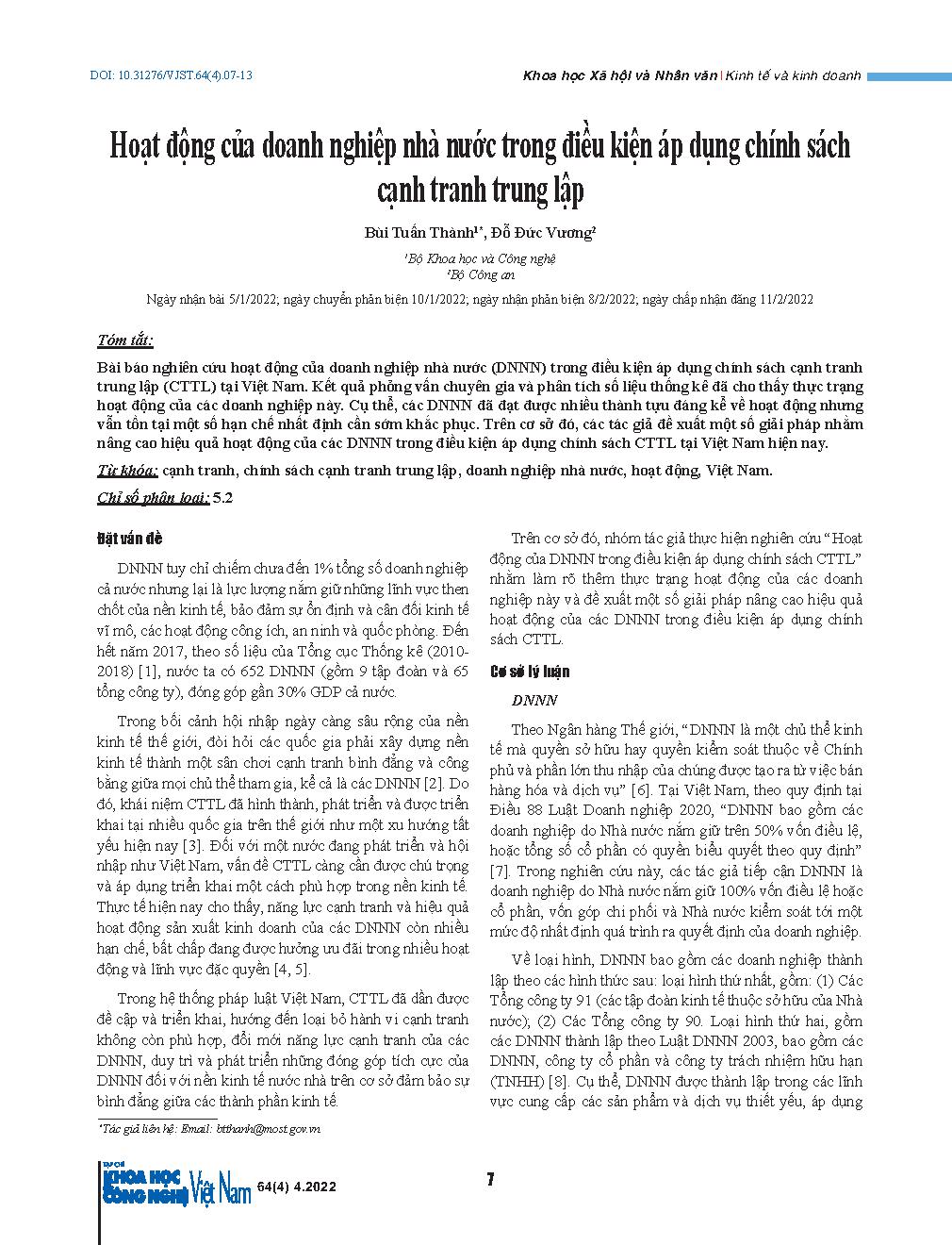 Hoạt động của doanh nghiệp nhà nước trong điều kiện áp dụng chính sách cạnh tranh trung lập = The operation of SOEs in the context of applying a neutral competition policy