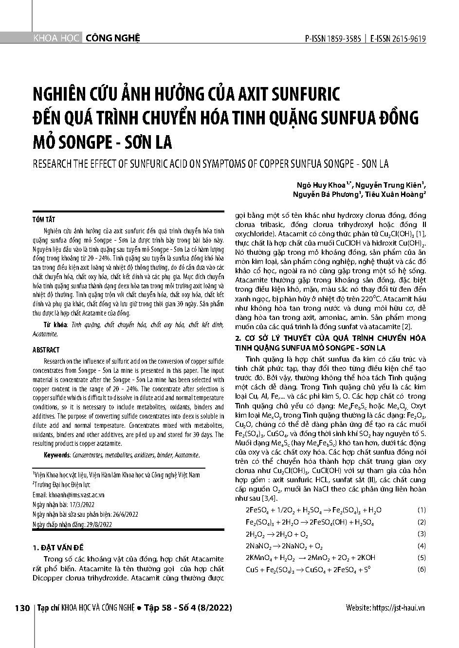 Nghiên cứu ảnh hưởng của axit sunfuric đến quá trình chuyển hóa tinh quặng sunfua đồng mỏ Songpe - Sơn La = Research the effect of sunfuric acid on symptoms of copper sunfua songpe - Son La