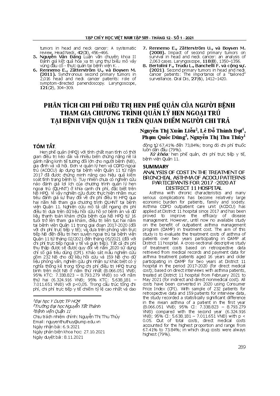 Phân tích chi phí điều trị hen phế quản của người bệnh tham gia chương trình quản lý hen ngoại trú tại Bệnh viện Quận 11 trên quan điểm người chi trả = Analysis of cost in the treatment of bronchial asthma of accou patterns participants for 2017 -2020 at District 11 hospital