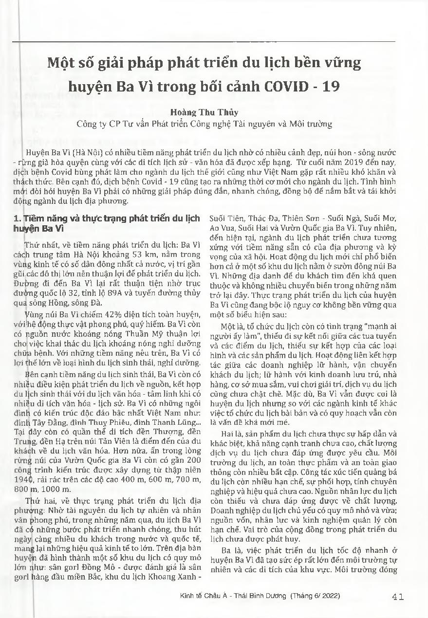 Một số giải pháp phát triển du lịch bền vững huyện Ba Vì trong bối cảnh COVID -19