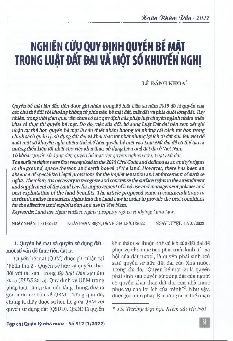 Nghiên cứu quy định quyền bề mặt trong luật đất đai và một số khuyến nghị = Studying the provisions for surface rights in the Land Law and some recommendations