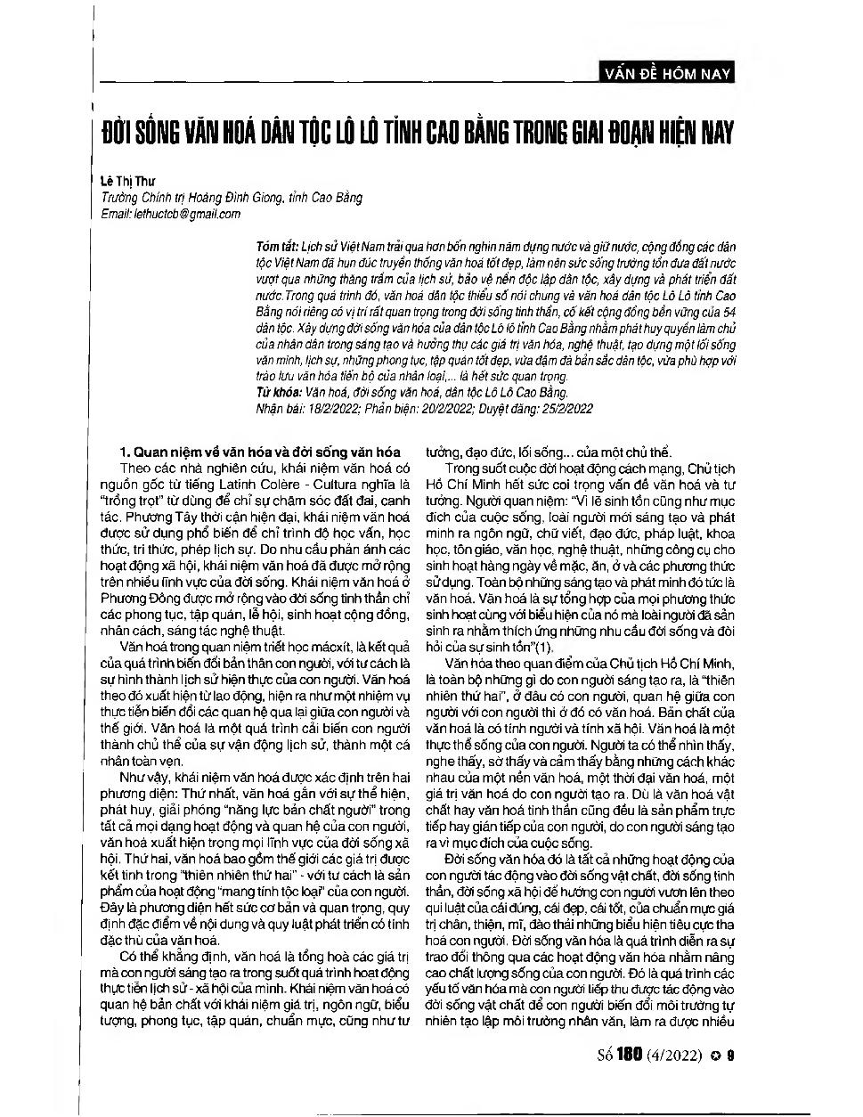 Đời sống văn hóa dân tộc Lô Lô tính Cao Bằng trong giai đoạn hiên nay = Cultural life of Lo Lo ethnic group in Cao Bang province in the current period