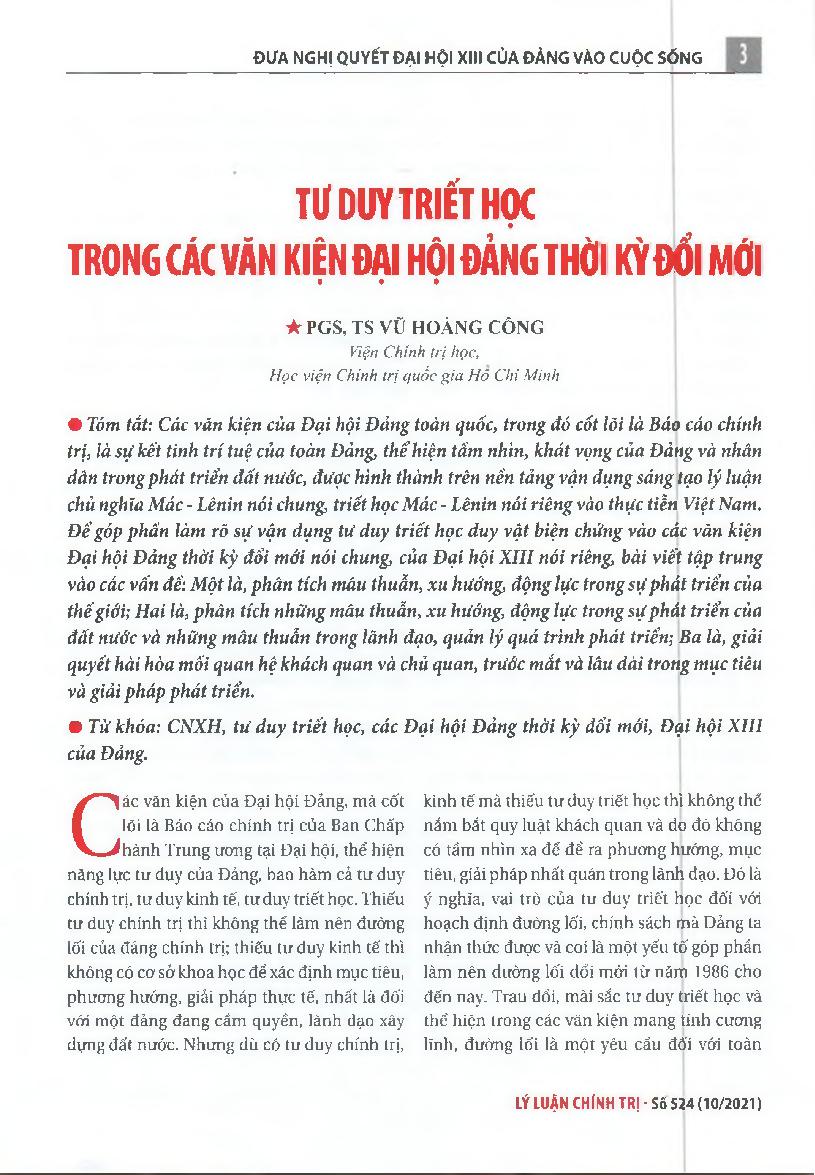 Tư duy triết học trong các văn kiện đại hội đảng thời kỳ đổi mới = Philosophical thinking in the documents of the Party Congresses in the renovation period