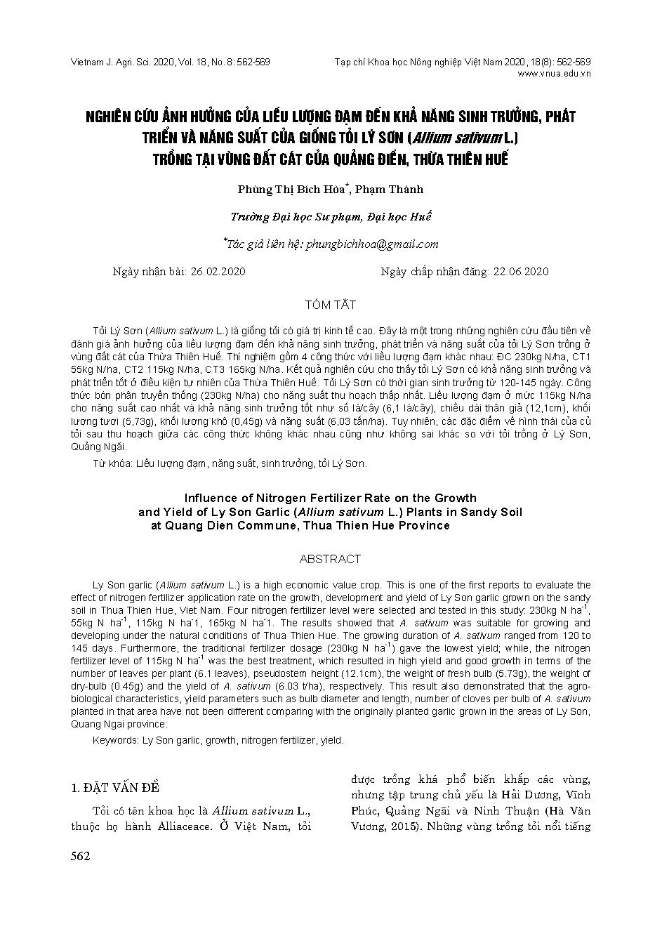 Nghiên cứu ảnh hưởng của liều lượng đạm đến khả năng sinh trưởng, phát triển và năng suất của giống tỏi Lý Sơn (Allium sativum L.) trồng tại vùng đất cát của Quảng Điền, Thừa Thiên Huế = Influence of Nitrogen Fertilizer Rate on the Growth and Yield of Ly Son Garlic (Allium sativum L.) Plants in Sandy Soil at Quang Dien Commune, Thua Thien Hue Province