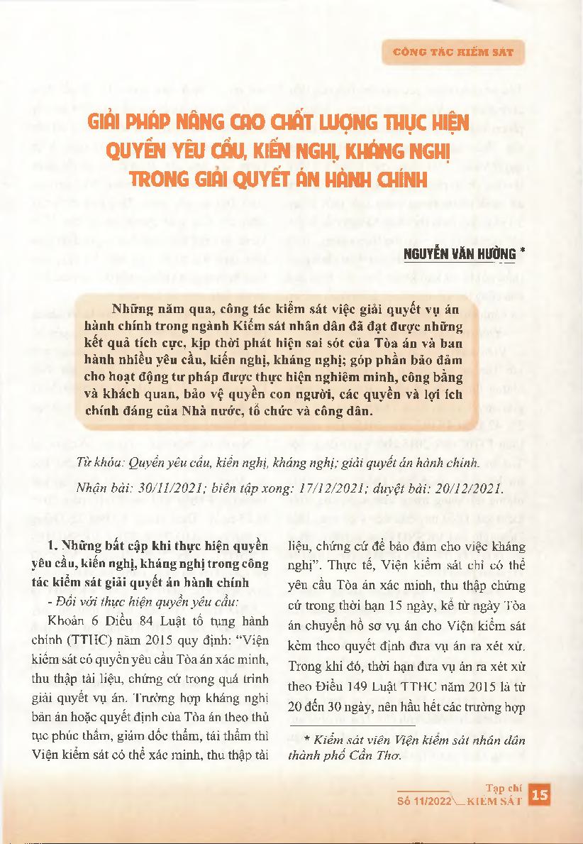 Giải pháp nâng cao chất lượng thực hiện quyền yêu cầu, kiến nghị, kháng nghị trong giải quyết án hành chính