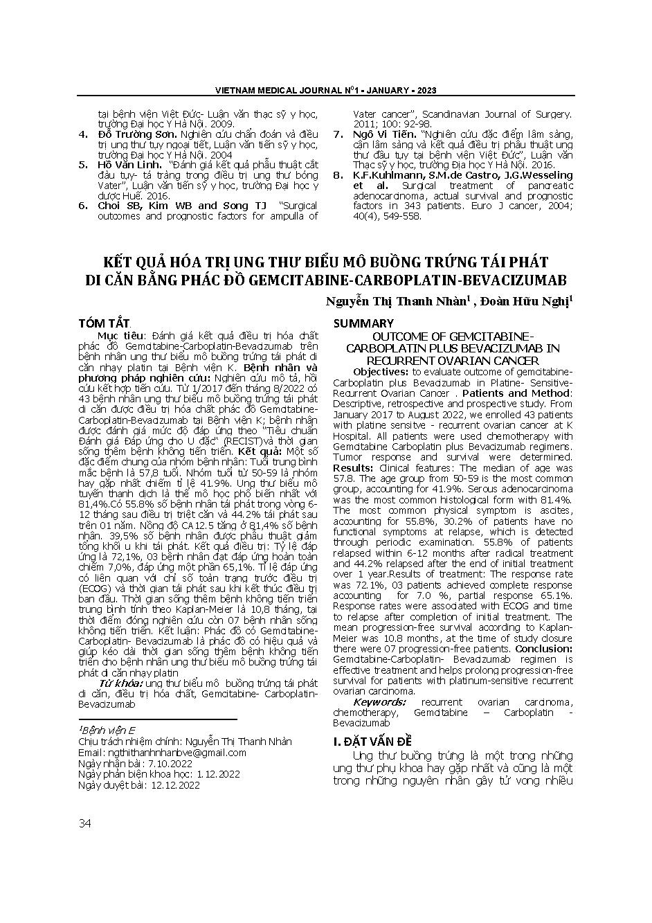 Kết quả hóa trị ung thư biểu mô buồng trứng tái phát di căn bằng phác đồ Gemcitabine-Carboplatin-Bevacizumab = Outcome of Gemcitabine-Carboplatin plus Bevacizumab in recurrent ovarian cancer
