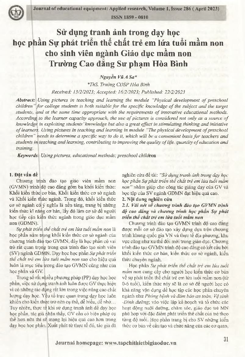 Sử dụng tranh ảnh trong dạy học học phần Sự phát triển thể chất trẻ em lứa tuổi mầm non cho sinh viên ngành Giáo dục mầm non Trường Cao đẳng Sư phạm Hòa Bình = Using pictures in teaching the subject of Physical development of preschool children for studen