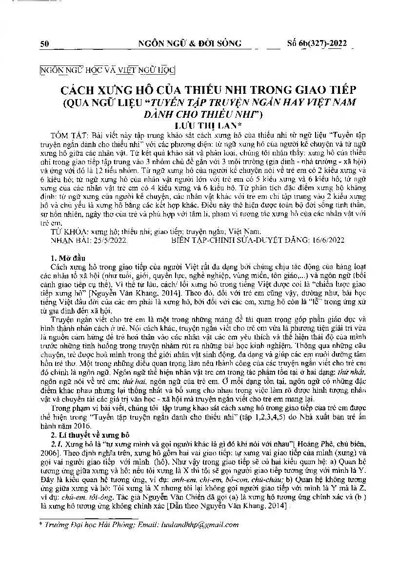 Cách xưng hô của thiếu nhi trong giao tiếp (qua ngủ liệu “tuyển tập truyện ngắn hay việt nam dành cho thiếu nhi") = Children&; 39;s term of address in communication (through the corpus "a collection of Vietnamese short stories for children")