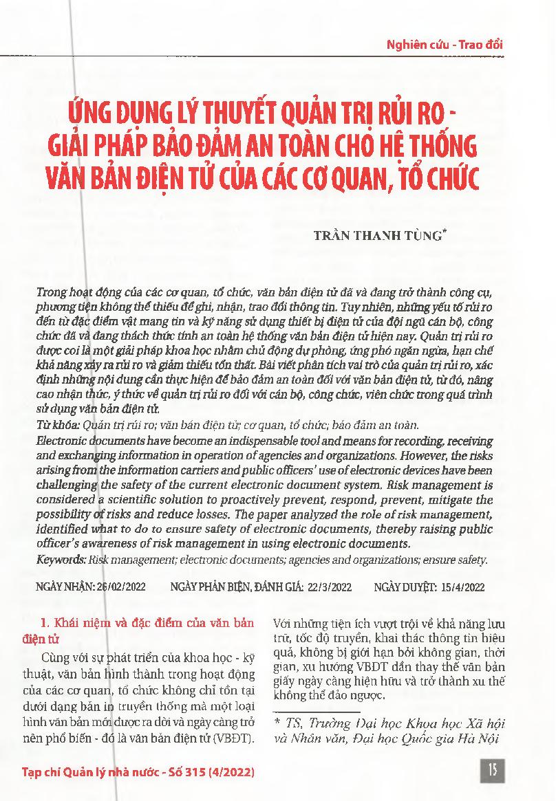 Ứng dụng lý thuyết quản trị rủi R0 - giải pháp bảo đảm an toàn cho hệ thống văn bản điện tử của các cơ quan, tổ chức = Application of the risk management theory - solutions to ensure safety of the electronic document system in agencies and organizations