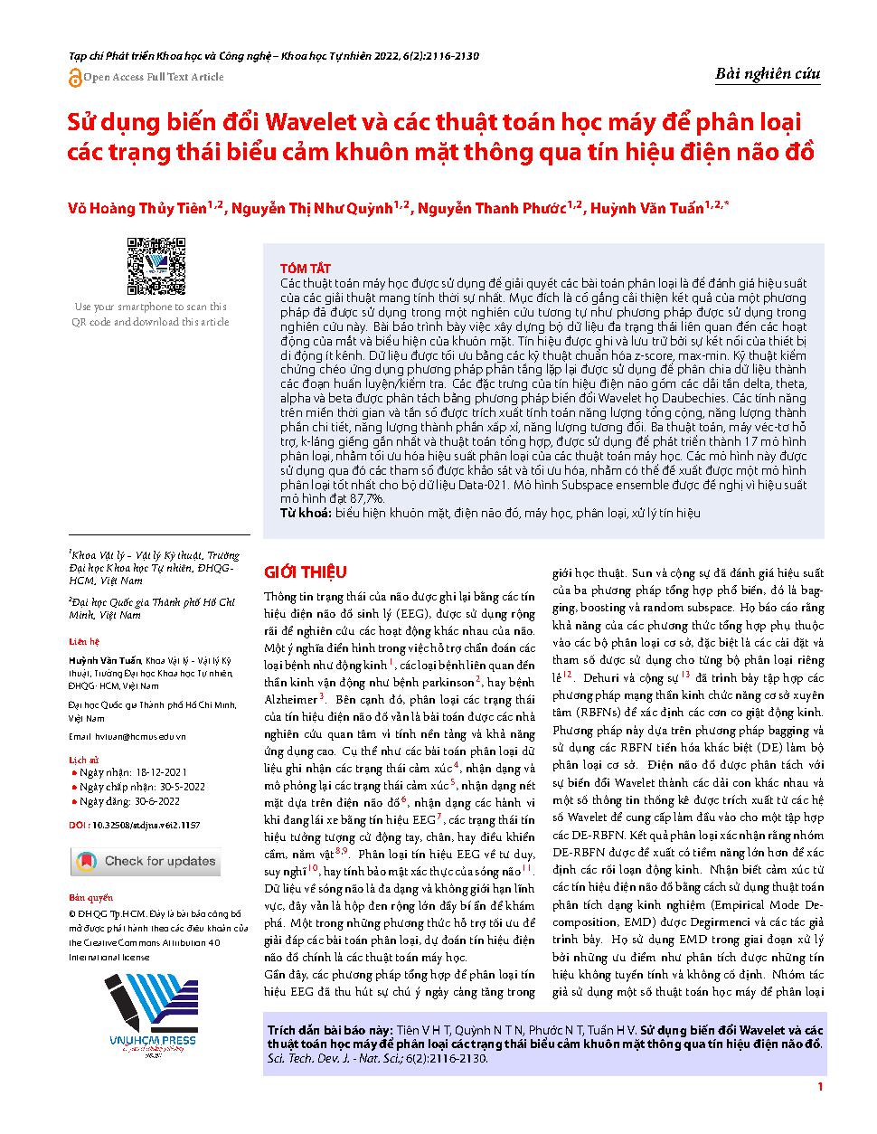 Sử dụng biến đổi Wavelet và các thuật toán học máy để phân loại các trạng thái biểu cảm khuôn mặt thông qua tín hiệu điện não đồ = Using wavelet transform for features extraction and machine learning algorithms to classify the facial expression by eeg sig