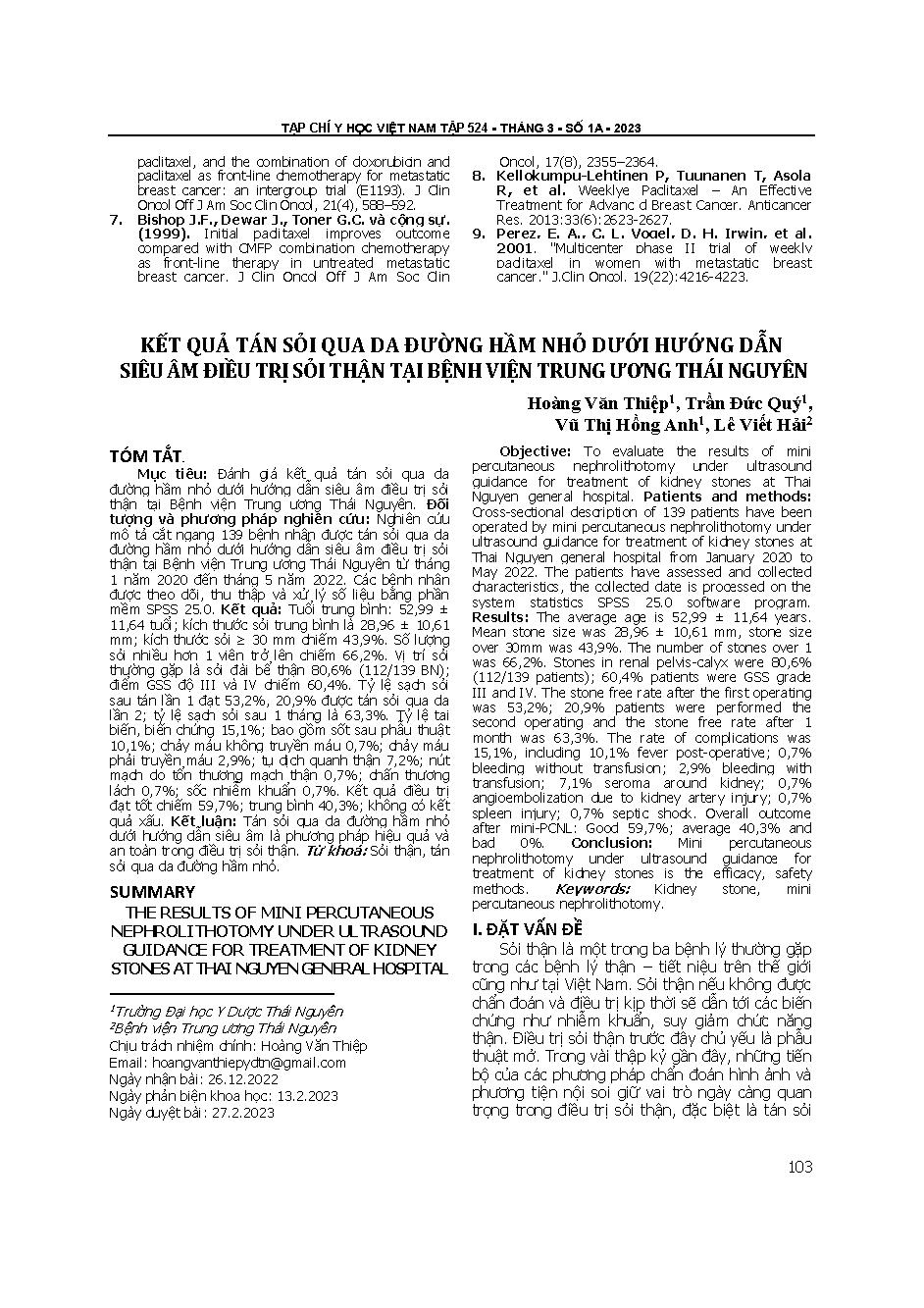 Kết quả tán sỏi qua da đường hầm nhỏ dưới hướng dẫn siêu âm điều trị sỏi thận tại Bệnh viện Trung ương Thái Nguyên = The results of mini percutaneous nephrolithotomy under ultrasound guidance for treatment of kidney stones at Thai Nguyen general hospital