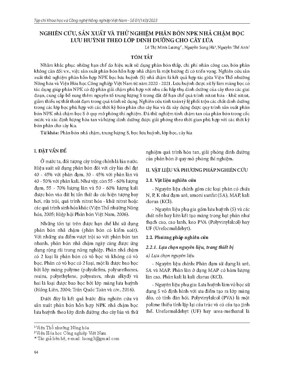Nghiên cứu, sản xuất và thử nghiệm phân bón NPK nhả chậm bọc lưu huỳnh theo lớp dinh dưỡng cho cây lúa = Research, production and testing of slow-release sulfur-coated NPK fertilizer for rice plants
