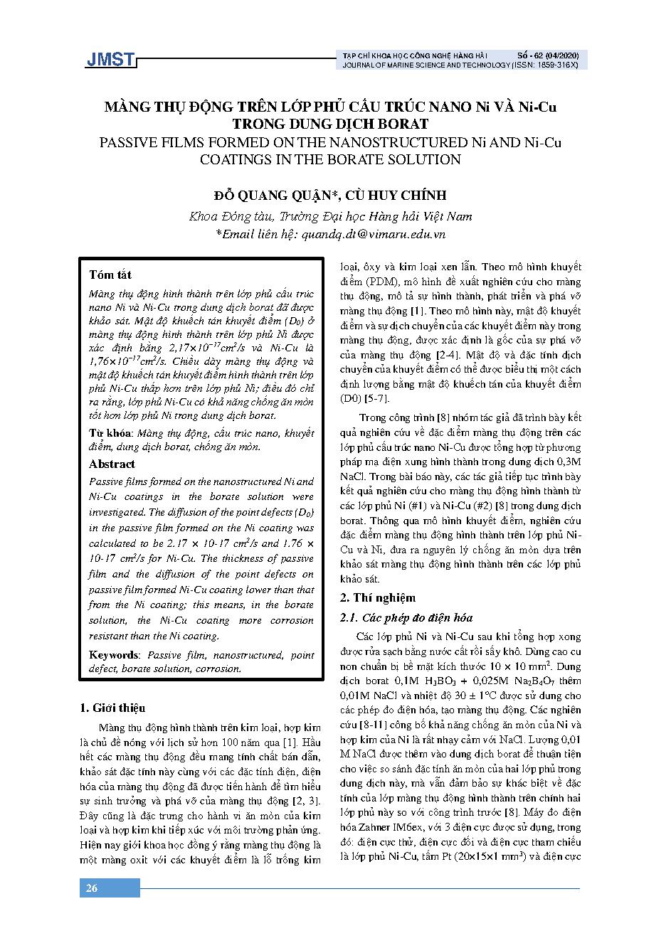 MÀNG THỤ ĐỘNG TRÊN LỚP PHỦ CẤU TRÚC NANO Ni VÀ Ni-Cu TRONG DUNG DỊCH BORAT = PASSIVE FILMS FORMED ON THE NANOSTRUCTURED Ni AND Ni-Cu COATINGS IN THE BORATE SOLUTION