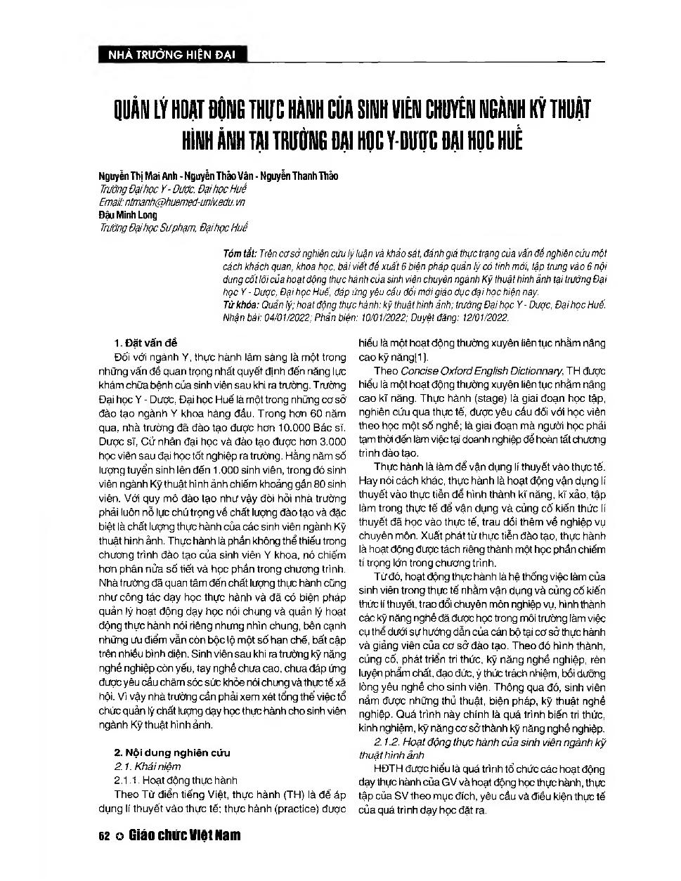 Quản lý hoạt động thực hành của sinh viên chuyên ngành kỹ thuật hình ảnh tại trường Đại học Y Dược - Đại học Huế = Managing practice activities of the students majoring in imaging technology at the University of Medicine and Pharmacy, Hue University