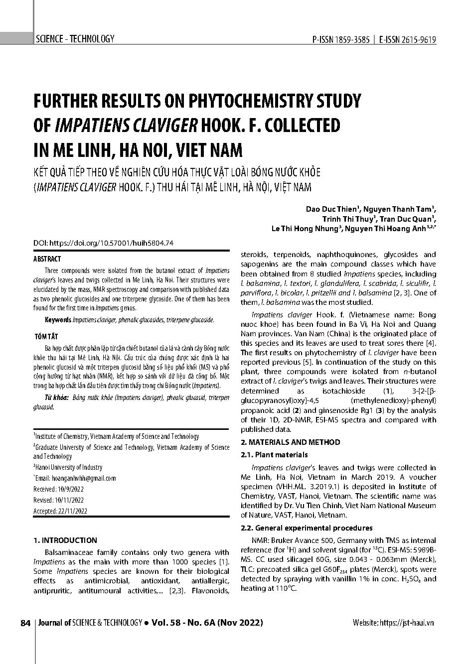 Kết quả tiếp theo về nghiên cứu hóa thực vật loài bóng nước khỏe (Impatiens Claviger Hook. F.) thu hái tại Mê Linh, Hà Nội, Việt Nam = Further results on phytochemistry study of Impatiens Claviger Hook. F. collected in Me Linh, Ha Noi, Viet Nam