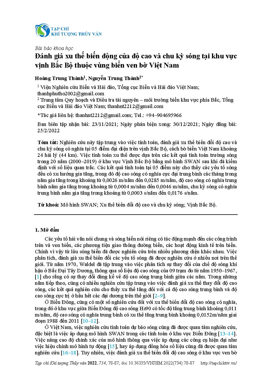 Đánh giá xu thế biến động của độ cao và chu kỳ sóng tại khu vực vịnh Bắc Bộ thuộc vùng biển ven bờ Việt Nam = Evaluation of the wave height and period trends in the Gulf of Tonkin in the coastal area of Vietnam
