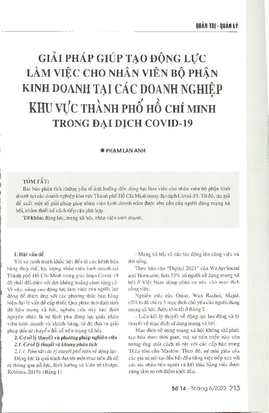 Giải pháp giúp tạo động lực làm việc cho nhân viên bộ phận kinh doanh tại các doanh nghiệp khu vực thành phố Hồ Chí Minh trong đại dịch Covid-19 = Solutions to motive sales workers of enterprises in Ho Chi Minh City during the COVID-19 pandemic