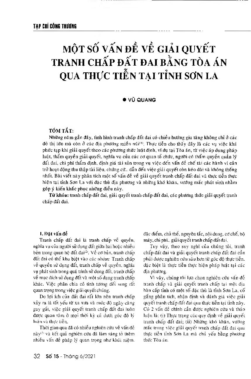 Một số vấn đề về giải quyết tranh chấp đất đai bằng Tòa án qua thực tiễn tại tỉnh Sơn La = Some problems arising during the land dispute settlement at the court in Son La Province