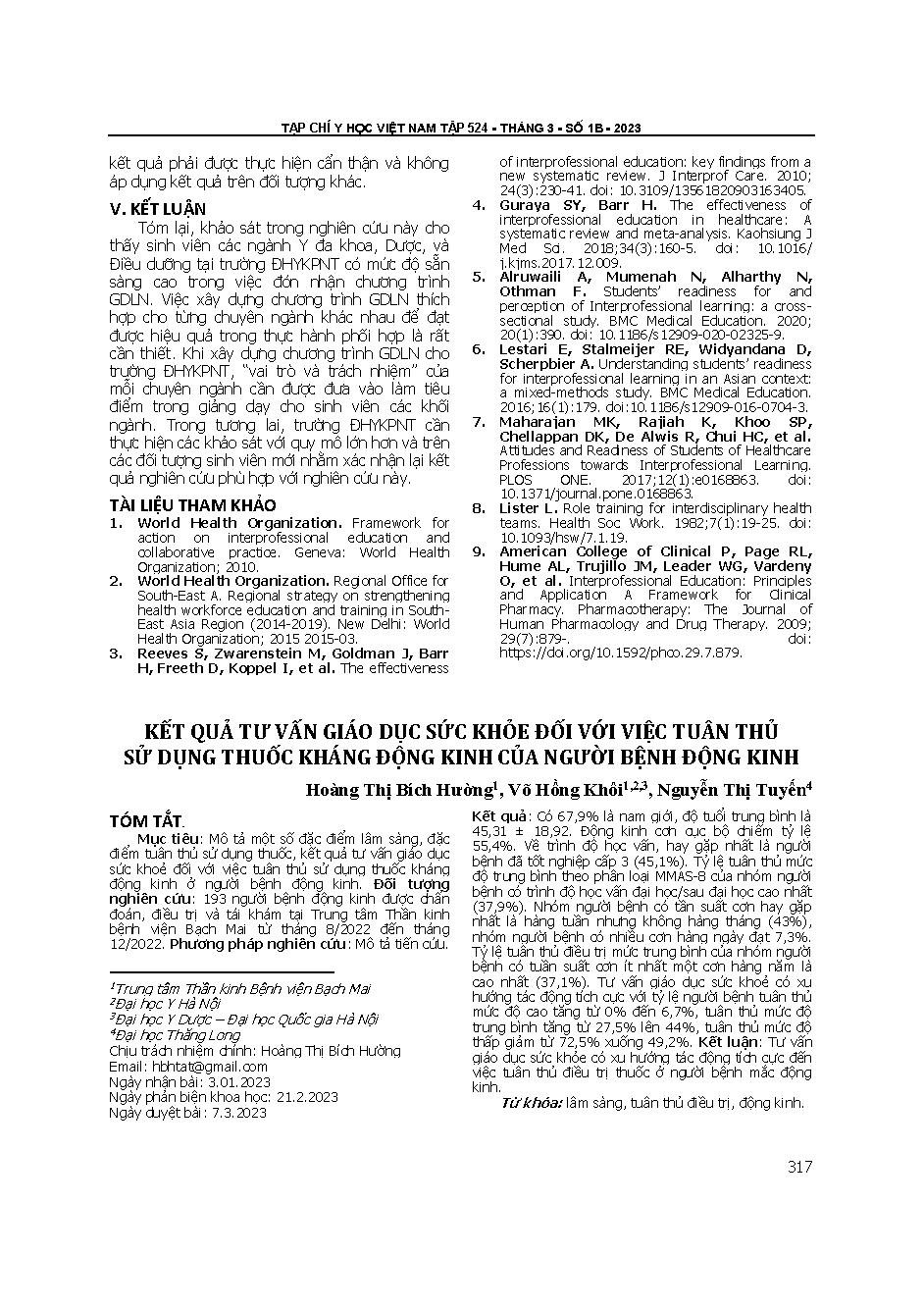 Kết quả tư vấn giáo dục sức khỏe đối với việc tuân thủ sử dụng thuốc kháng động kinh của người bệnh động kinh = Result of health education consultation on antiepileptic drug adherence in patients with epilepsy