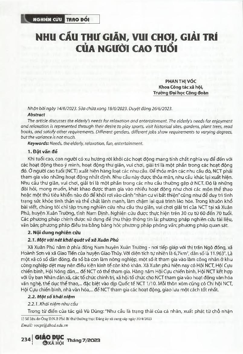 Nhu cầu thư giãn, vui chơi, giải trí cùa người cao tuổi = Elderly's needs for relaxation and entertainment.