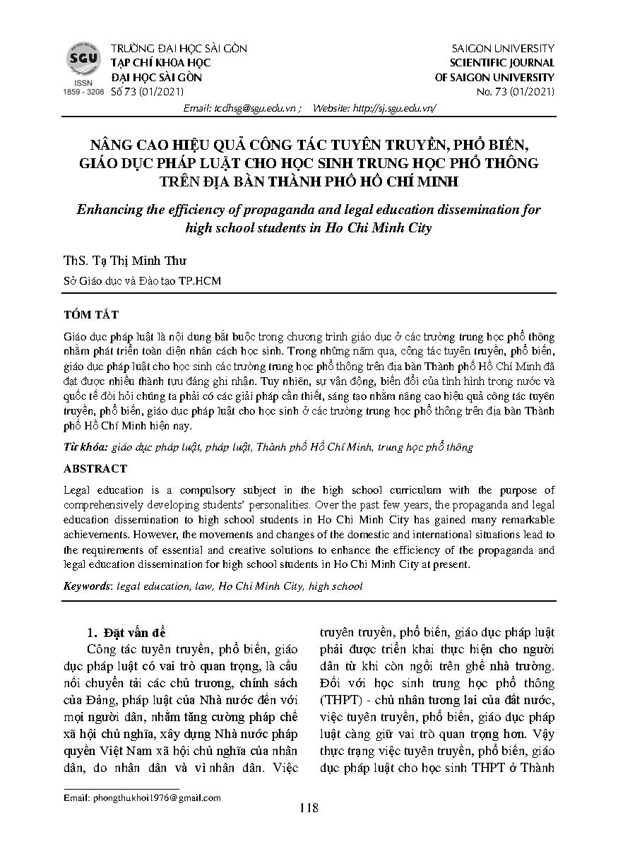 Nâng cao hiệu quả công tác tuyên truyền, phổ biến, giáo dục pháp luật cho học sinh trung học phổ thông trên địa bàn Thành phố Hồ Chí Minh