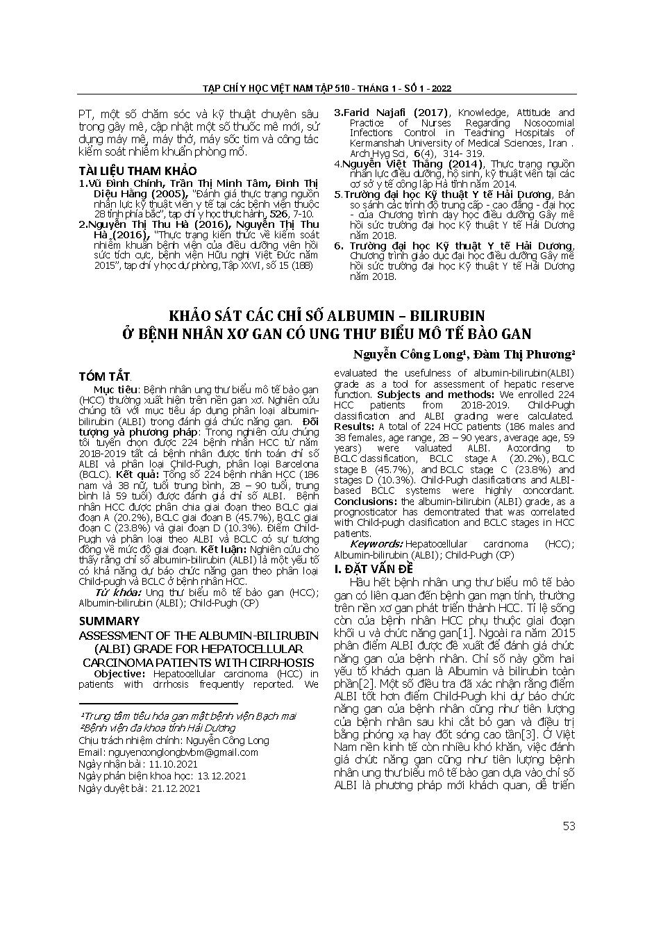 Khảo sát các chỉ số albumin – bilirubin ở bệnh nhân xơ gan có ung thư biểu mô tế bào gan = Assessment of the albumin-bilirubin (ALBI) grade for hepatocellular carcinoma patients with cirrhosis