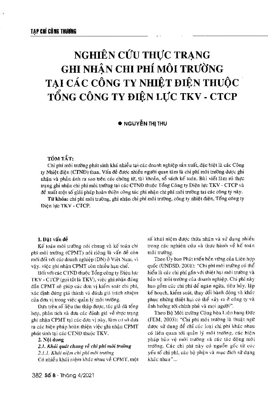 Nghiên cứu thực trạng ghi nhận chi phí môi trường tại các công ty Nhiệt điện thuộc Tổng Công ty Điện lực TKV - CTCP