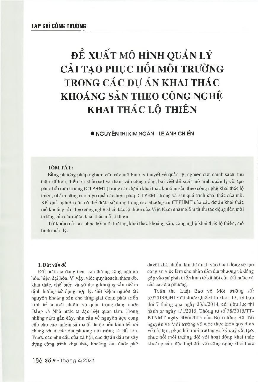Đề xuất mô hình quản lý cải tạo phục hồi môi trường trong các dự án khai thác khoáng sản theo công nghệ khai thác lộ thiên