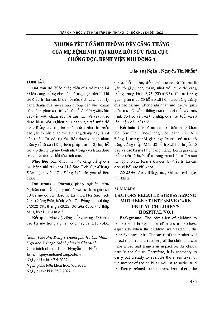 Những yếu tố ảnh hưởng đến căng thẳng của mẹ bệnh nhi tại Khoa Hồi sức tích cực - chống độc, Bệnh viện Nhi đồng 1 = Factors related stress among mothers at intensive care unit at Children&; 39;s hospital no.1