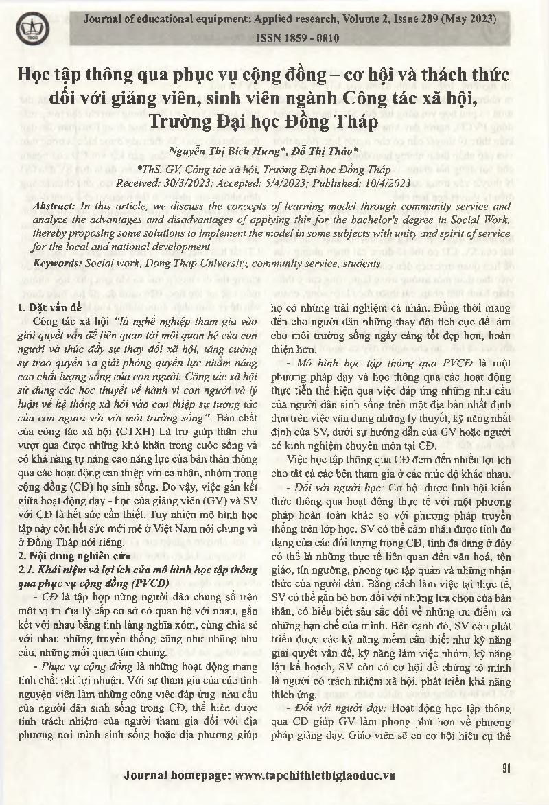 Học tập thông qua phục vụ cộng đồng - cơ hội và thách thức đối với giảng viên, sinh viên ngành Công tác xã hội, Trường Đại học Đồng Tháp = Learning through community service - opportunities and challenges for lecturers and students majoring in Social Work