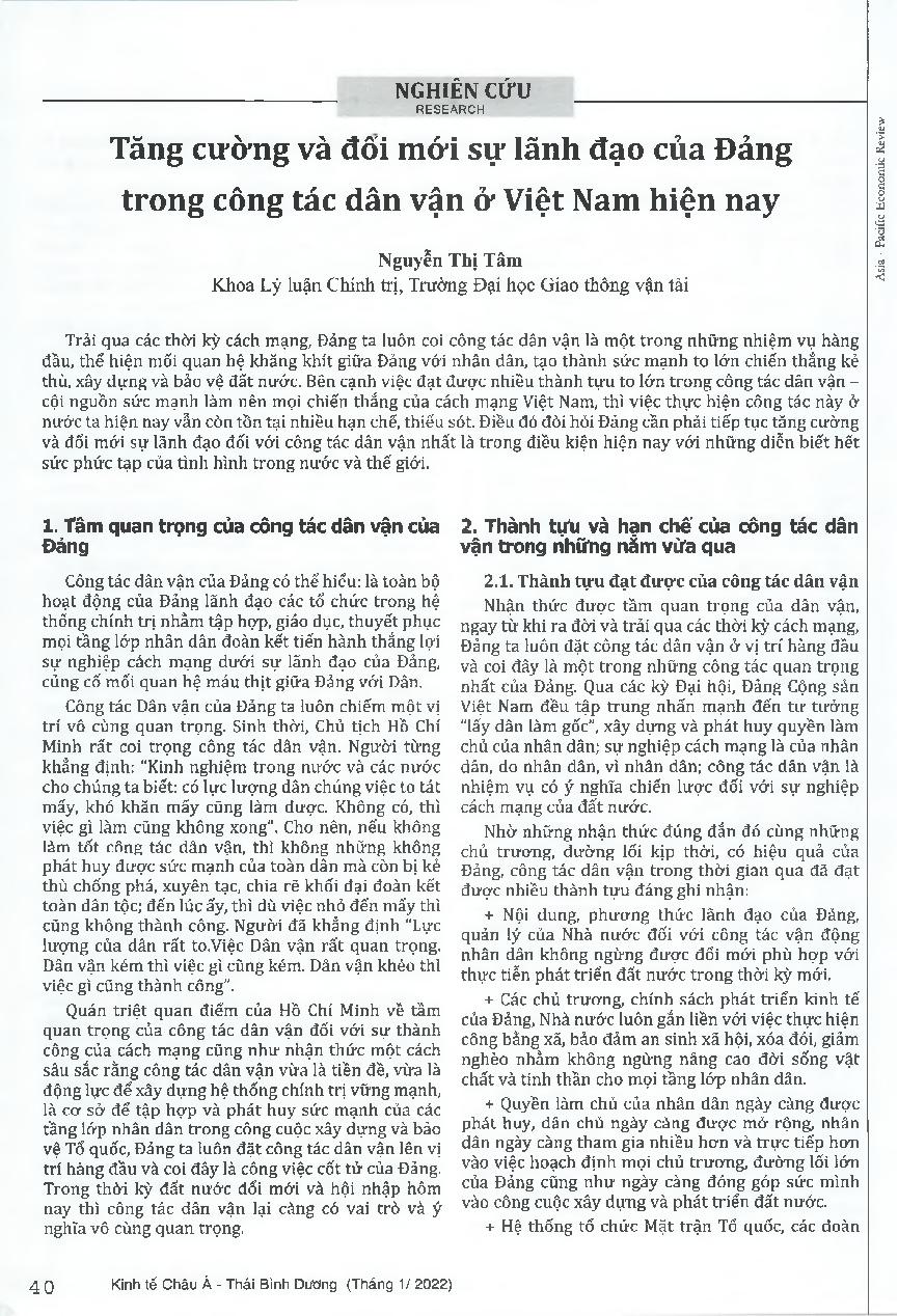 Tăng cường và đổi mới sự lãnh đạo của Đảng trong công tác dân vận ở Việt Nam hiện nay