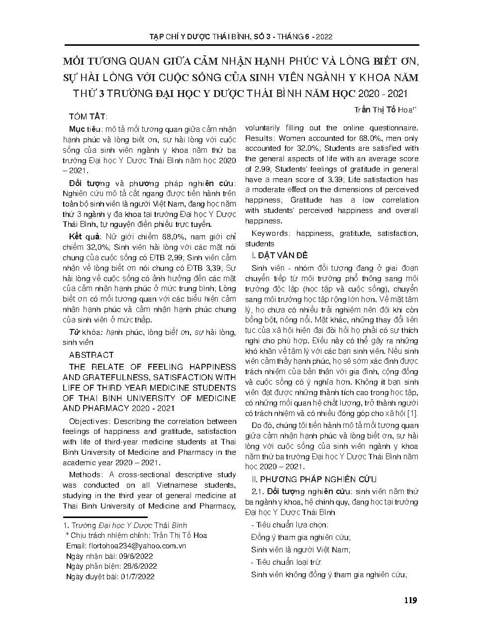 Mối tương quan giữa cảm nhận hạnh phúc và lòng biết ơn, sự hài lòng với cuộc sống của sinh viên ngành Y khoa năm thứ 3 Trường Đại học Y Dược Thái Bình năm học 2020 - 2021 = The relate of feeling happiness and gratefulness, satisfaction with life of third