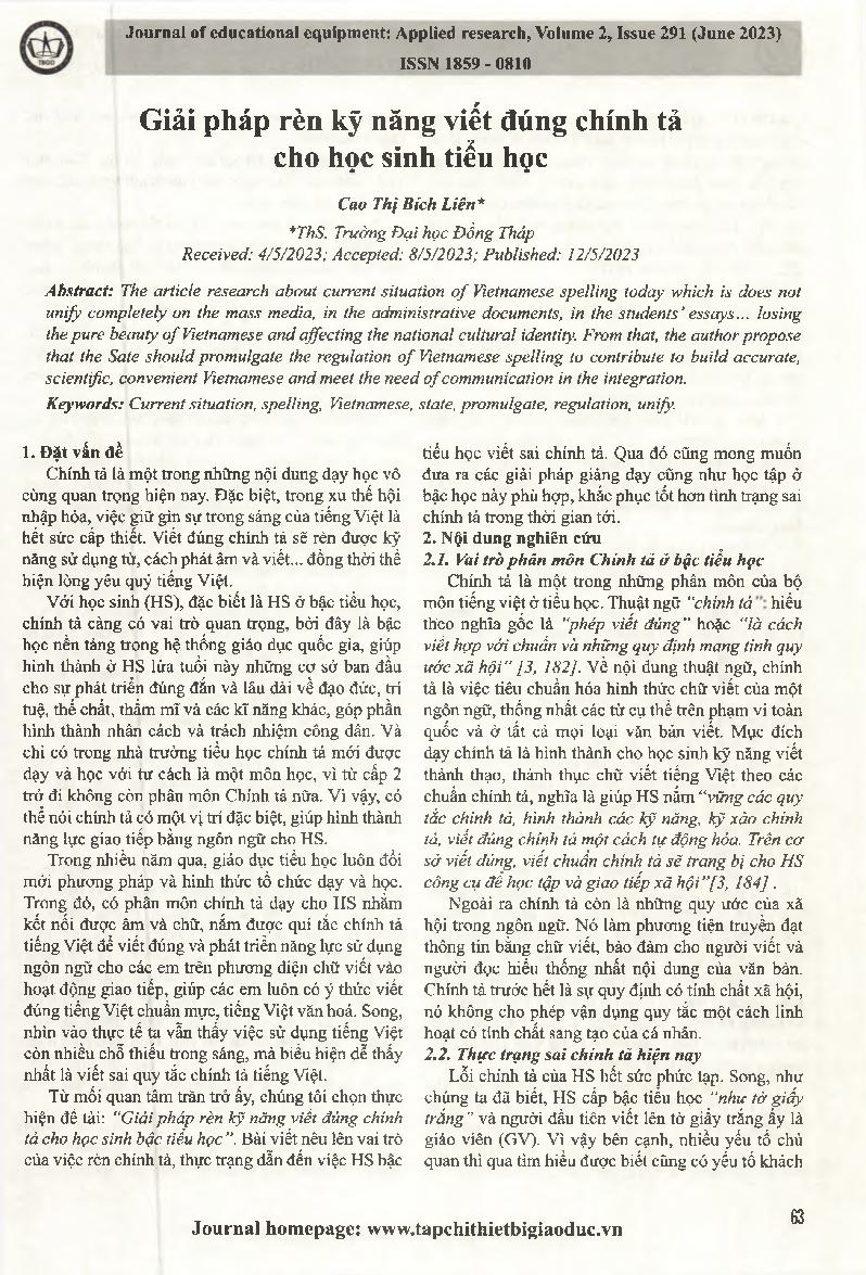 Giải pháp rèn kỹ năng viết đúng chính tả cho học sinh tiểu học = Solutions to practice correct spelling skills for primary school students