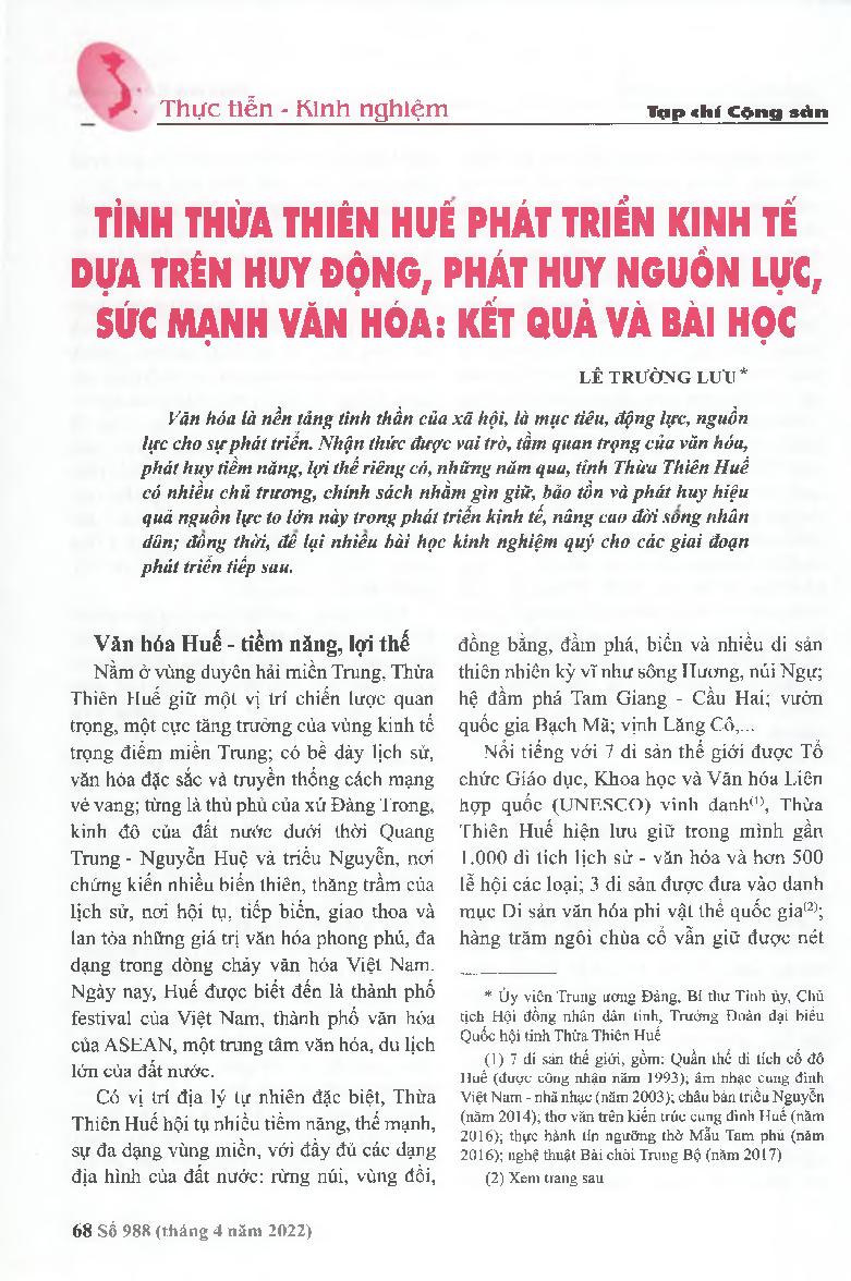 Tỉnh Thừa Thiên Huế phát triển kinh tế dựa trên huy động, phát huy nguồn lực, sức mạnh văn hóa: Kết quả và bài học = Thua Thien Hue province&; 39;s economic development is based on mobilizing, promoting resources and cultural strength: Results and lessons