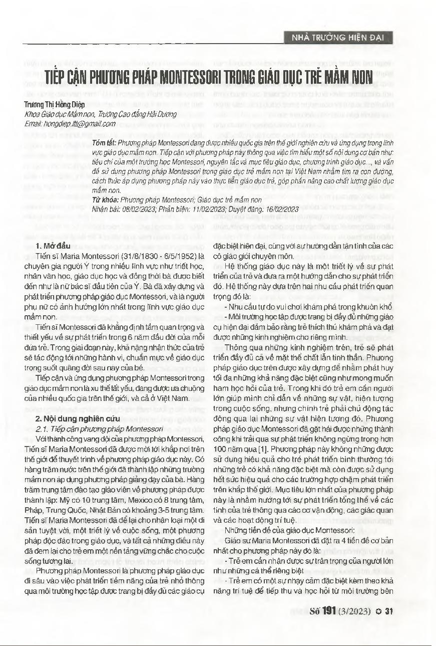 Tiếp cận phương pháp Montessori trong giáo dục trẻ mầm non = Approaching the Montessori method in preschool education