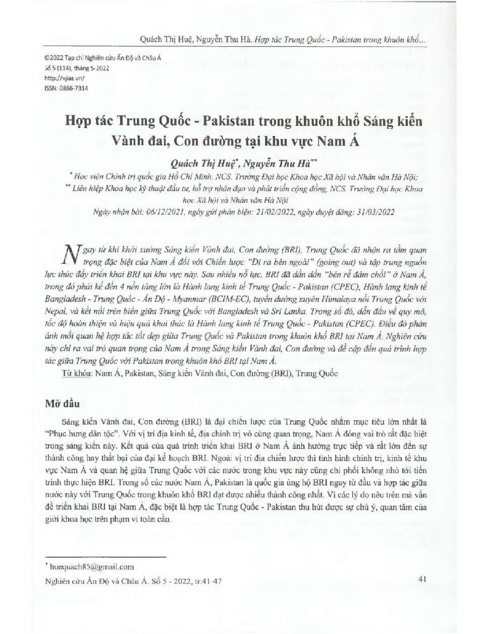 Hợp tác Trung Quốc - Pakistan trong khuôn khổ Sáng kiến Vành đai, Con đường tại khu vực Nam Á = China - Pakistan cooperation under the Belt and Road Initiative in South Asia