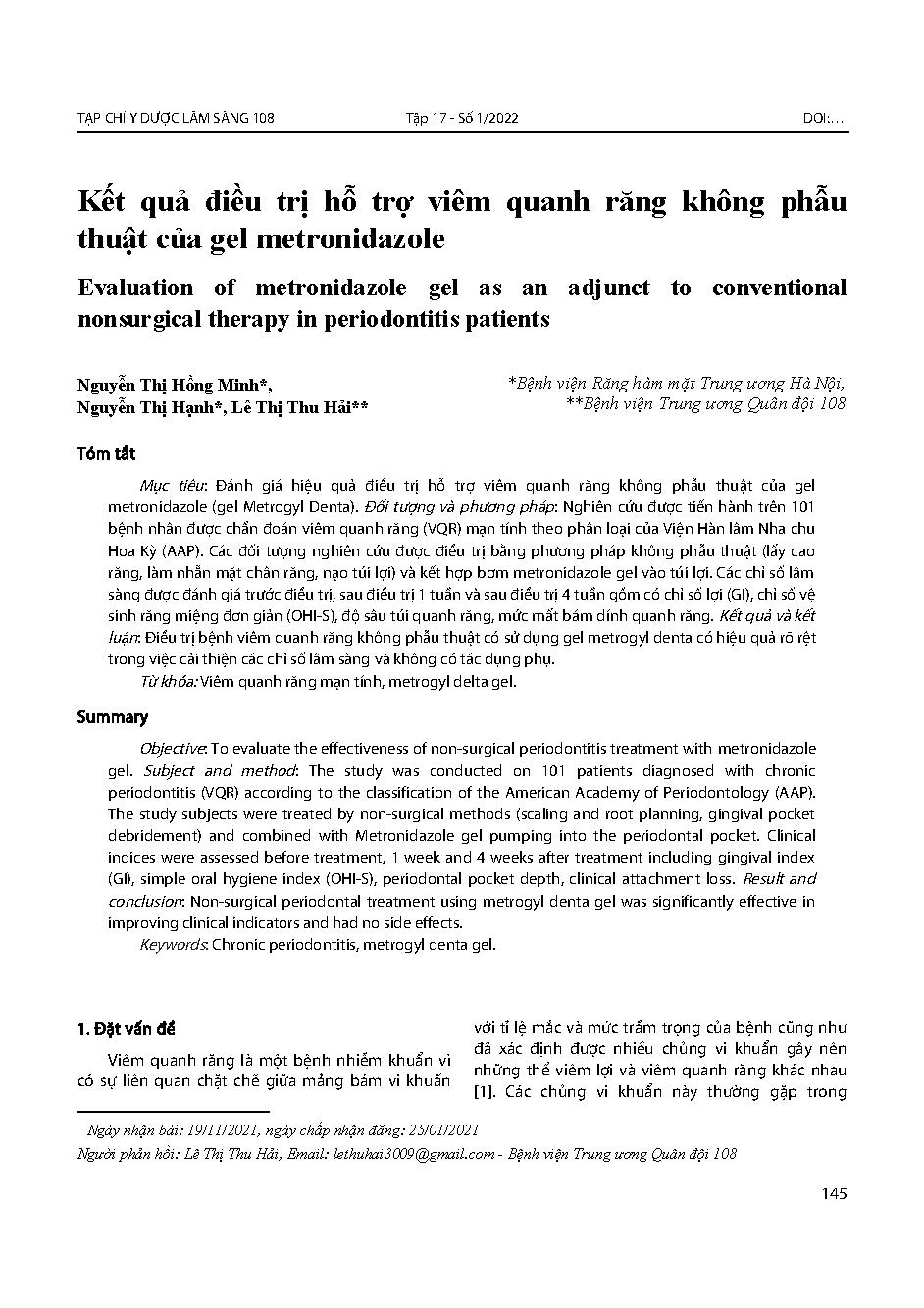 Kết quả điều trị hỗ trợ viêm quanh răng không phẫu thuật của gel metronidazole = Evaluation of metronidazole gel as an adjunct to conventional nonsurgical therapy in periodontitis patients