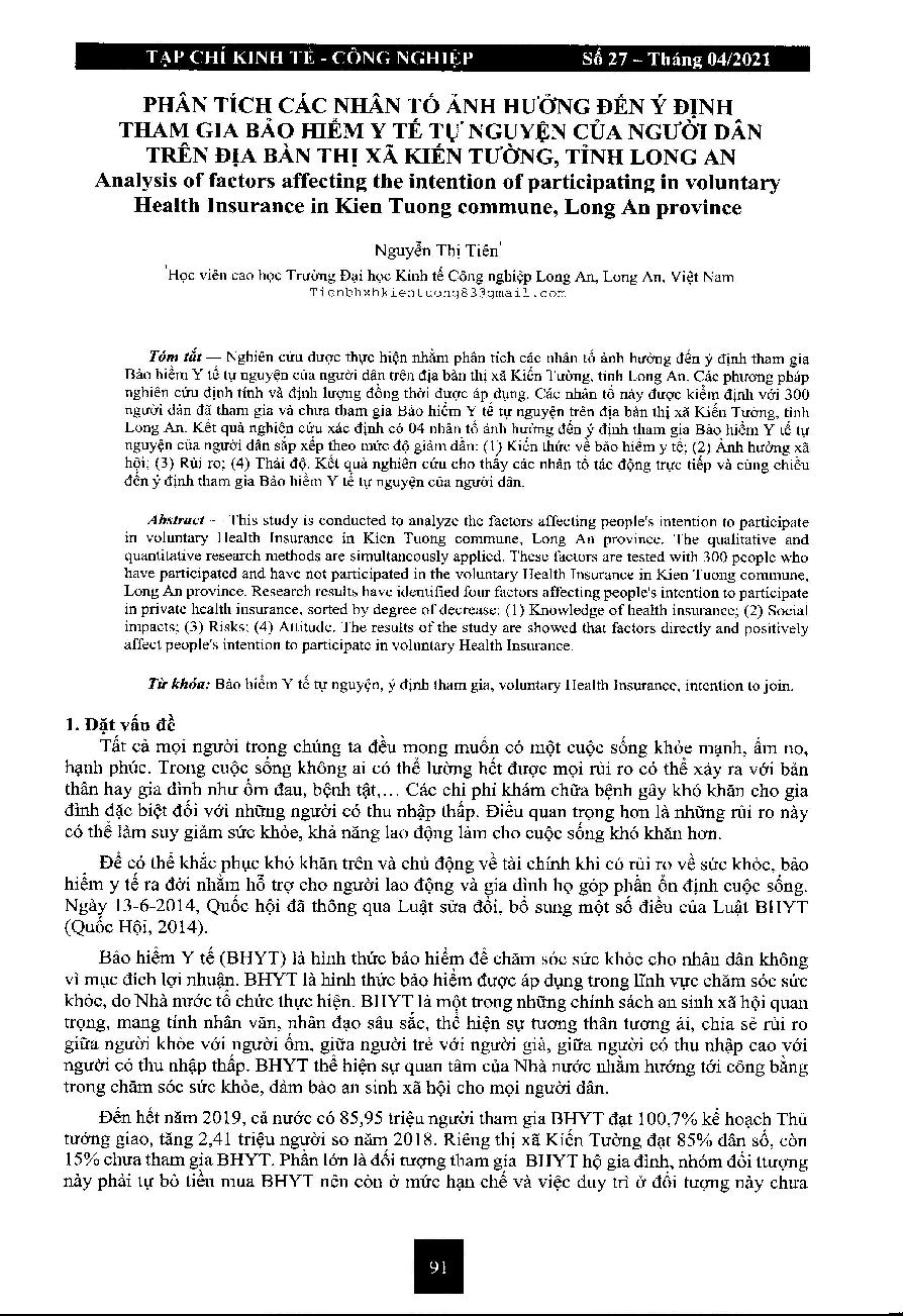 Phân tích các nhân tố ảnh hưởng đến ý định tham gia Bảo hiểm Y tế tự nguyện của người dân trên địa bàn thị xã Kiến Tường, tỉnh Long An = Analysis of factors affecting the intention of participating in voluntary Health Insurance in Kien Tuong commune, Long An province