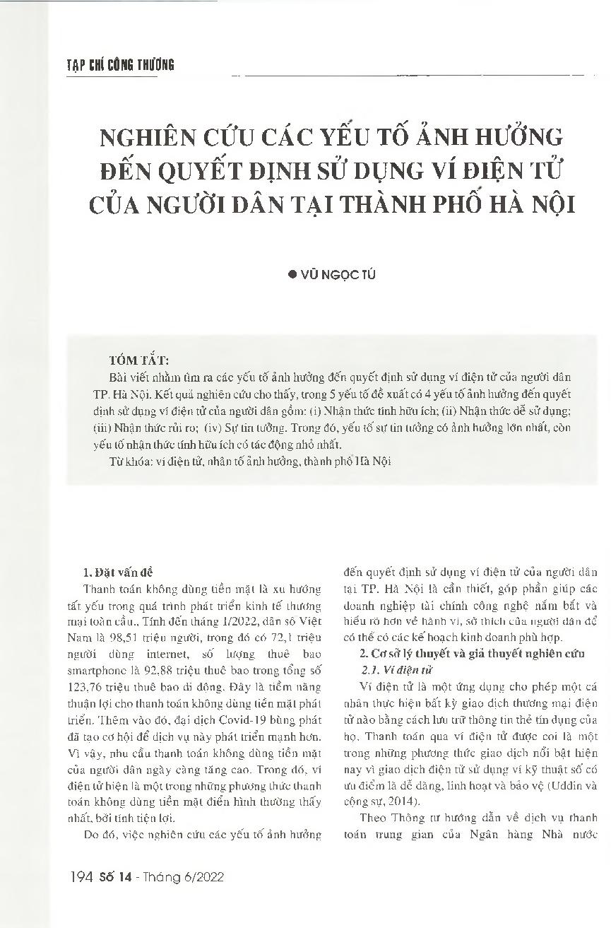 Nghiên cứu các yếu tố ảnh hưởng đến quyết định sử dụng ví điện tử của người dân tại thành phố Hà Nội = Factors affecting the decisions of Hanoians to use e-wallet