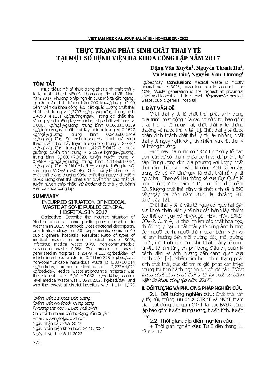 Thực trạng phát sinh chất thải y tế tại một số Bệnh viện Đa khoa Công lập năm 2017 = Incurred situation of medical waste at some public general hospitals in 2017