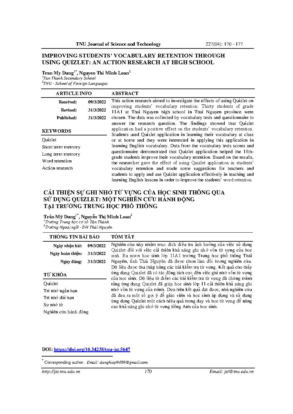 Cải thiện sự ghi nhớ từ vựng của học sinh thông qua sử dụng Quizlet: Một nghiên cứu hành động tại trường trung học phổ thông = Improving students’ vocabulary retention through using Quizlet: An action research at high school