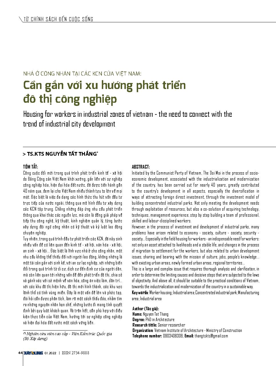 Nhà ở công nhân tại các KCN của Việt Nam: Cần gắn với xu hướng phát triển đô thị công nghiệp = Housing for workers in industrial zones of vietnam - the need to connect with the trend of industrial city development