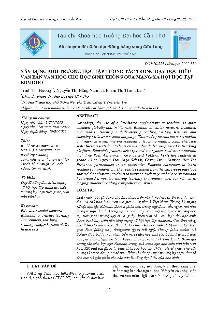 Xây dựng môi trường học tập tương tác trong dạy đọc hiểu văn bản văn học cho học sinh thông qua mạng xã hội học tập Edmodo = Building an interactive learning environment in teaching reading comprehension fiction text for grade 10 through Edmodo education