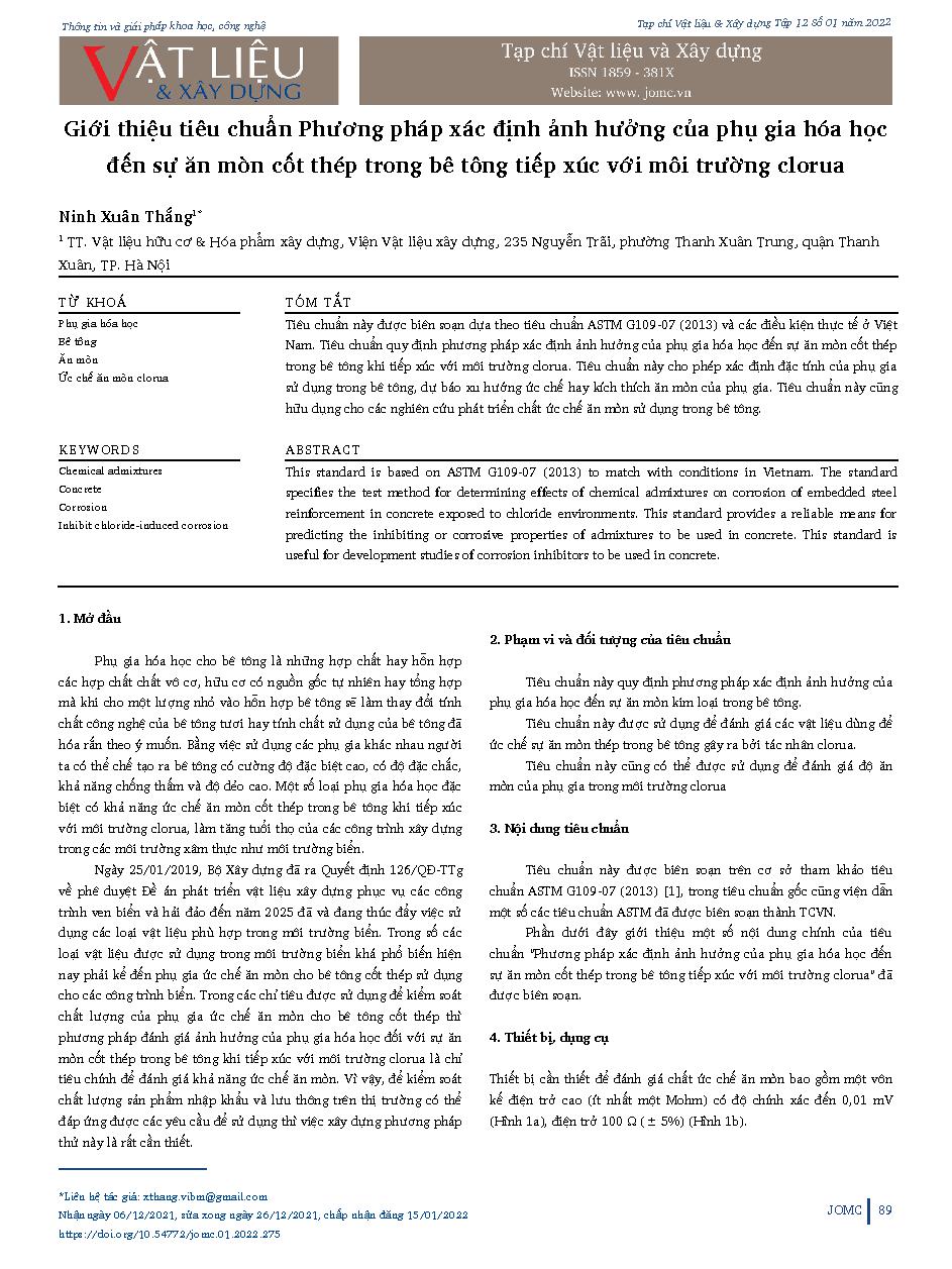 Giới thiệu tiêu chuẩn Phương pháp xác định ảnh hưởng của phụ gia hóa học đến sự ăn mòn cốt thép trong bê tông tiếp xúc với môi trường clorua