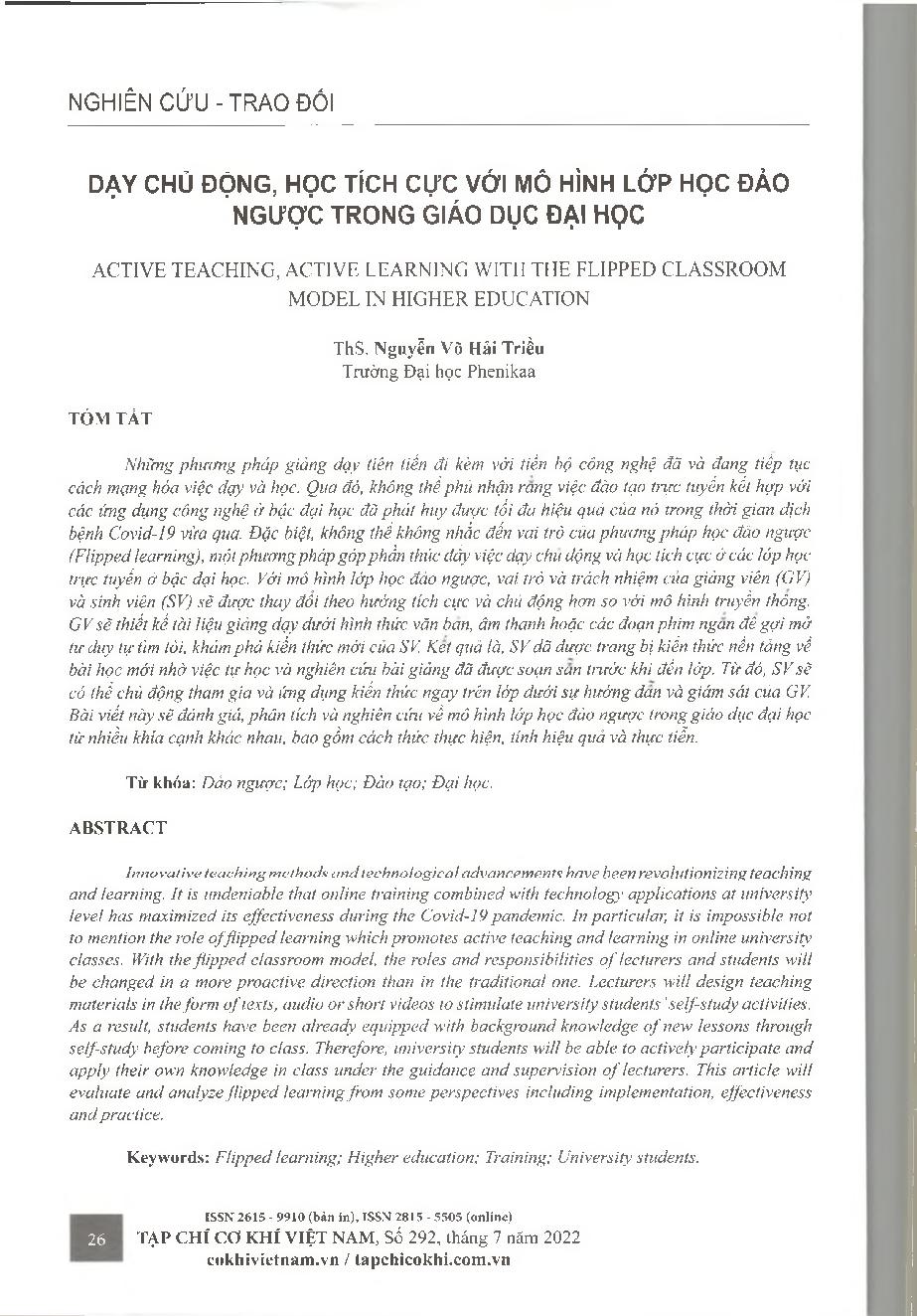Dạy chủ động, học tích cực với mô hình lớp học đảo ngược trong giáo dục đại học = Active teaching, active learning with the flipped classroom model in higher education