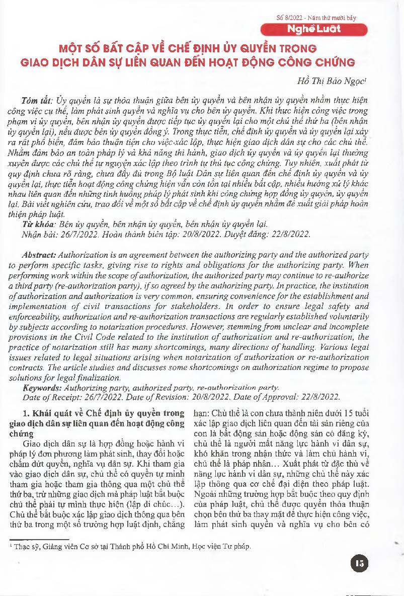 Một số bất cập về chế định ủy quyền trong giao dịch dân sự liên quan đến hoạt động công chứng = Some shortcomings of authorization regime in civil transaction related to notarial activity
