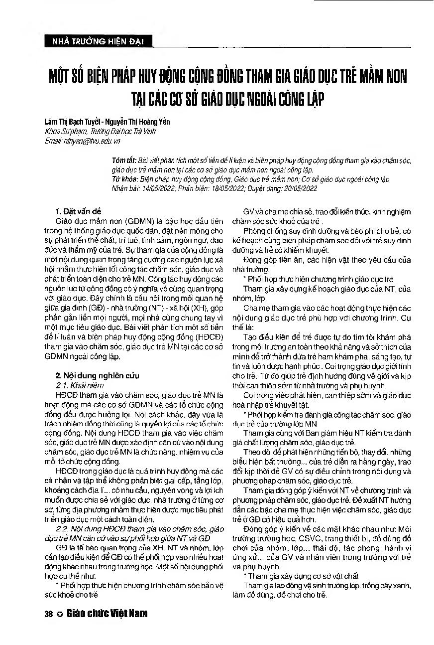 Một số biện pháp huy động cộng đồng tham gia giáo dục trẻ mầm non tại các cơ sở giáo dục ngoài công lập = Some measures to mobilize the community to participate in preschool education at non-public educational institutions