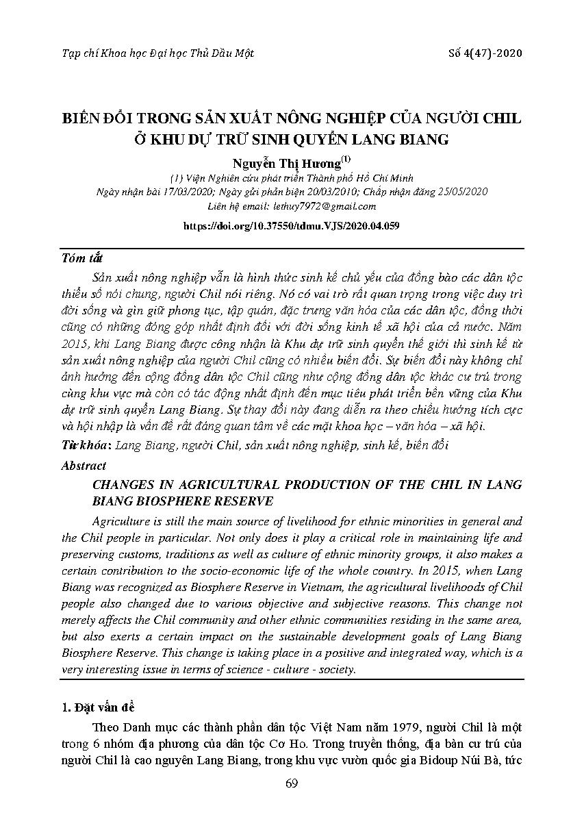 Biến đổi trong sản xuất nông nghiệp của người Chil ở khu dự trữ sinh quyển Lang Biang = Changes in agricultural production of the Chil in Lang Biang biosphere reserve