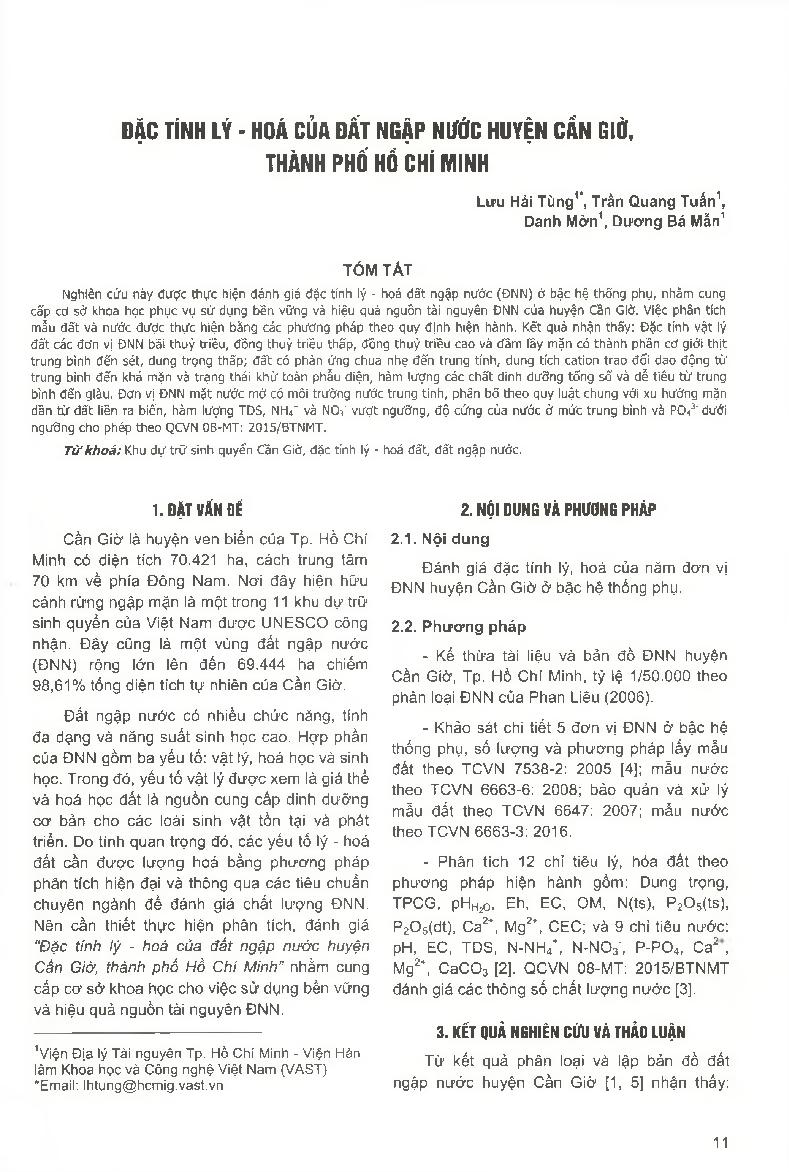 Đặc tính lý - hoá của đất ngập nước huyện cần Giờ, Thành phố Hồ Chí Minh = Physico-chemical characteristics of wetlands in Can Gio district, Ho Chi Minh City